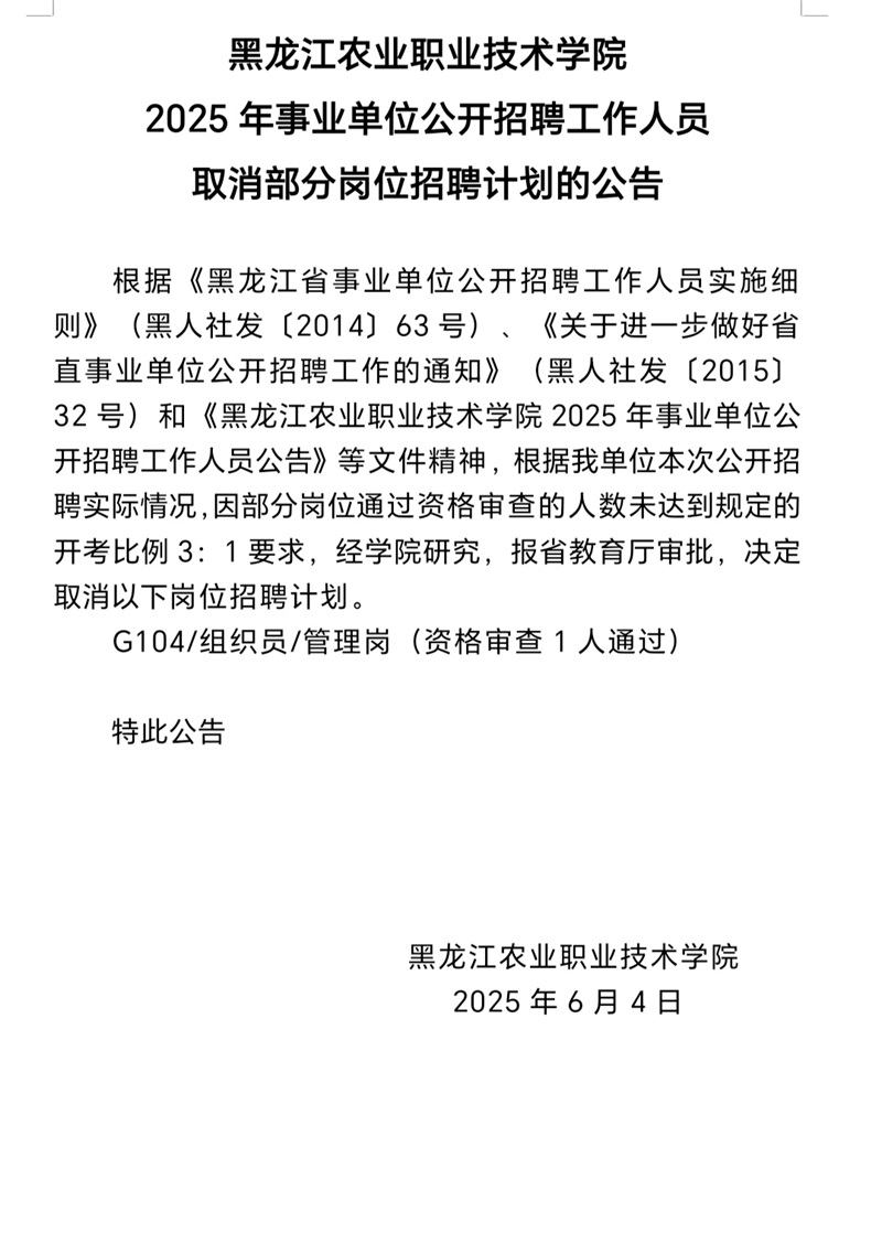 【公开招聘】黑龙江农业职业技术学院 2025年事业单位公开招聘工作人员 取消部分岗位招聘计划的公告